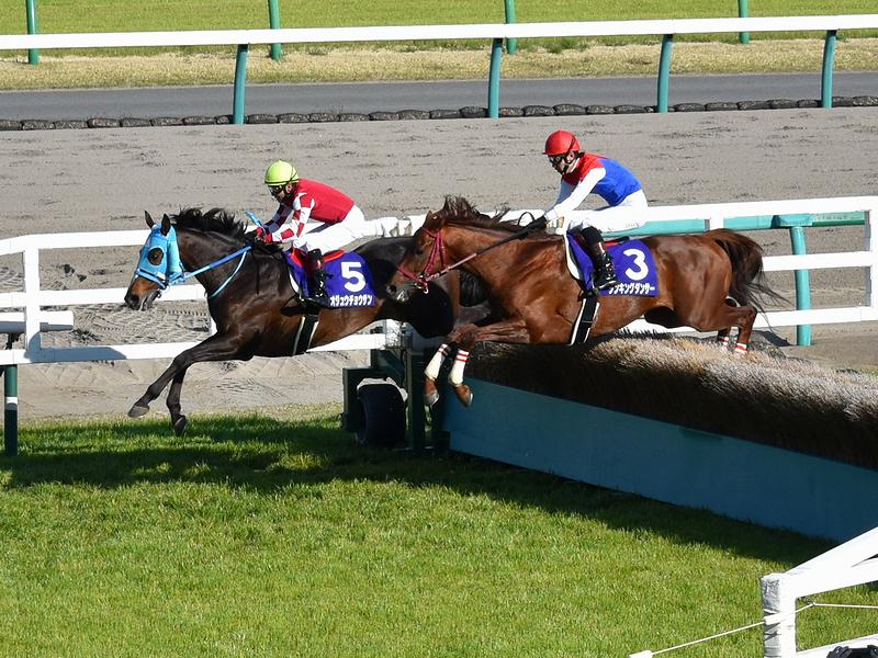 【最終障害を飛越する(5)オジュウチョウサン号と(3)シンキングダンサー号】