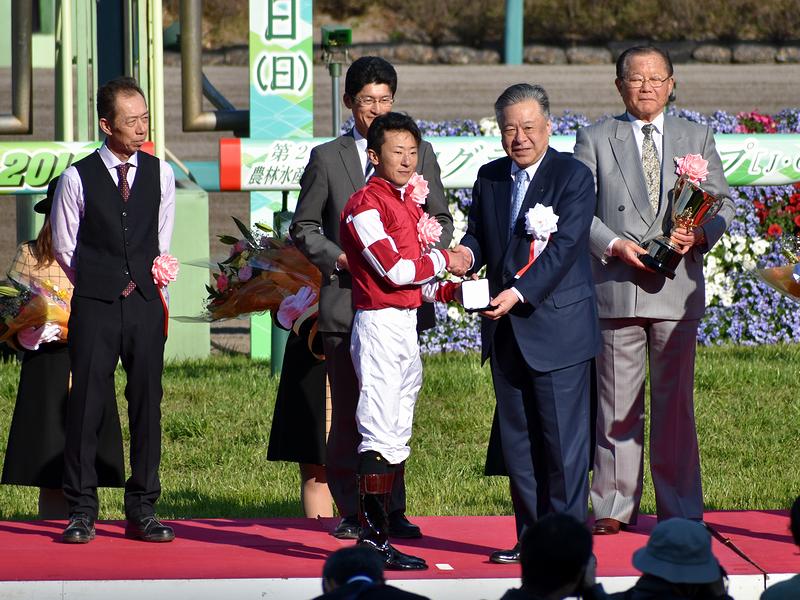レースの余韻も冷めやらぬまま、表彰式へ。勝ったオジュウチョウサン号はもちろん、石神騎手、和田調教師、長沼厩務員、そして長山オーナーや生産された坂東牧場をはじめとしてこの競走馬にかかわる全ての方々に感謝したいと思いました。