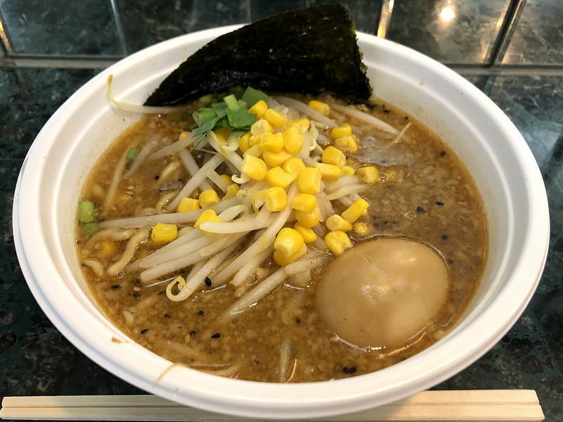 そんな中、何故か一番人気という特味噌こってり(チャーシューとゆで卵入り)ではなく、こちらの品をいってみることに。で、作るところを見ていたら、スープにたっぷりの背脂が入ってコッテリしてそうな感じだったのですが、一口目の印象はスパイシー。もちろん、背脂のコッテリ感や味噌感もあるけど、それよりもスパイスを感じます。また味付けは濃いめで、そのスープが浅草開花楼(こちらも、有名な製麺所です)製のムチモチガシっとし食感の太縮れ麺に絡み、これが、もう。また具は、茹でモヤシとコーンがサッパリ感を付与。ニラは飾り程度。そして半熟の味玉ですが、味付け自体は良いものの、スープが強いので印象としては埋もれ気味。(プレーンなゆで卵の方が合うかもしれません)