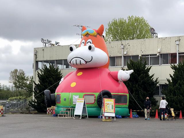 そうこうしているうちに待つ人も増え、予定どおり午前10時に開門。この日は、通常100円の入場料が無料でした。あと、ゴールデンウイーク中の開催らしく、入場してすぐのところには、金沢競馬場マスコット、ハッピー君のふあふあが。
