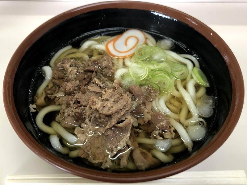 そんな中、今回は軽く肉うどんを。熱々のツユは出汁感わりとあって味付け甘味控えめ。うどんやや細めのゆで麺で、プリッとした歯触りと全体的に柔らかめの食感。そしてたっぷり入る牛肉はこちらもあまの甘くない味付で、ホロホロに煮込まれでいました。あと、1枚乗った赤巻(かまぼこ)が、とてもご当地っぽいですね。