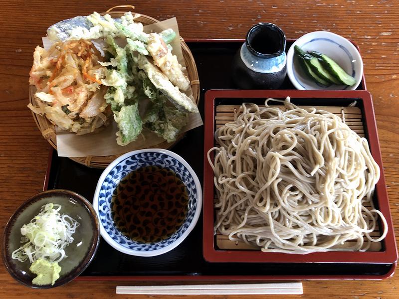 そんな中いただいたのがこちらの品。混み具合からしたら十分早い提供時間で登場しましたね。で、早速ソバをちょっとだけつまんでそのままいってみたのですが、更科と田舎蕎麦のの中間くらいに感じたそれは、敷地内の水車でそば粉を挽いているそう。そのお陰か、蕎麦の香りは季節的に厳しいと思いきや必要充分で、歯応え、喉越し共に良い感じです。そして次に、ツユに浸けていただけば、ほんの気持ち甘さ強めでしょうか。ですが癖のない、ちょうどよい味付だと思いました。それと天ぷらは、季節の野菜とのことですが、なかでもかき揚げが圧巻。ややガリっとした揚げ上がりですが、タネは甘さとジューシーさが際立つ新タマネギの他、香ばしい桜海老やスライスされた生しいたけなどが入っており、また大きも立派で、これ1つだけでかなりお腹に来ます。今回はソバを大盛りにしてしまったので、ソバの量とのバランス的には良かったものの、食べ終わる頃にはほんと、腹いっぱいになりました。そして最後は、蕎麦湯で〆るのですが、沢山ある天ぷらとの戦いで蕎麦ツユまで動員してしまったため、あまり堪能できなかったのは勿体無かったですね。