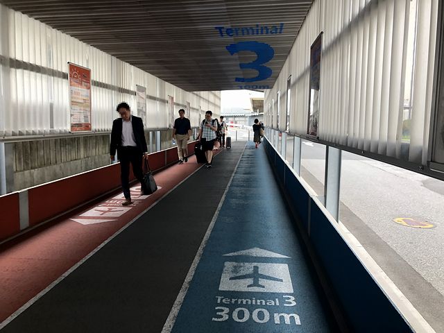体感的にはあっという間という感じで、定刻の午前10時1分頃(若干遅れたかも)、成田空港第2ビル駅に到着。ここから本格的に比較旅が始まるのですが、まずはLCCであるジェットスター・ジャパンということで、発着する第3ターミナルまで移動。改札口から地上に出て、そこから距離が600m程ある連絡通路を歩いて移動。第3ターミナルまでは無料の連絡バスもあったのですが、後学のためということで。で、数年前からウォーキングをたまにやるようになって、その程度の距離を歩くことは全く苦ではないのですが、途中の所々に残りの距離が表示されているのもあって、わりと楽に感じました。ただ、汗っかき故、歩いている途中からというか歩き終わった後しばらくの間吹き出し続ける汗でずぶ濡れになるのが嫌なんですよね。