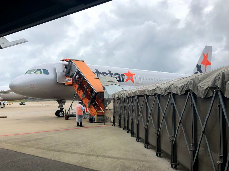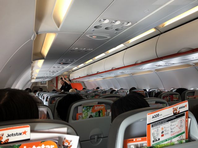 やがて11時15分頃、搭乗が開始に。まずは介助が必要な方や幼い子連れなどの優先搭乗となり、その次に、非常口座席の案内に。今回、990円の追加料金を払ってエクストラ・レッグルームという名称のシート間隔が広い非常口座席を指定したのですが、ジェットスターだと飛行機にちょっとだけ早く乗れるんですね。ただ正直油断していた(このタイミングで乗れると思っていなかった)ので、慌ててゲートを通って小雨の中を搭乗。使用機材はLCCの定番、エアバスA320-200(232)型機です。その機内はLCCらしく革張りのシートがびっしりという感じで並ぶも、前述のエクストラ・レッグルームは圧迫感もなく、私のような太ったというか前後に厚みのある人間でも快適に座れますね。その後、CAさんから非常口座席の説明を受け、更にその後しばらくして通常の出発時の説明をしているところ、定刻の11時45分より少々早く機体が動き出しました。