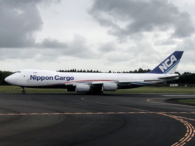 【滑走路手前で見た日本貨物航空機】