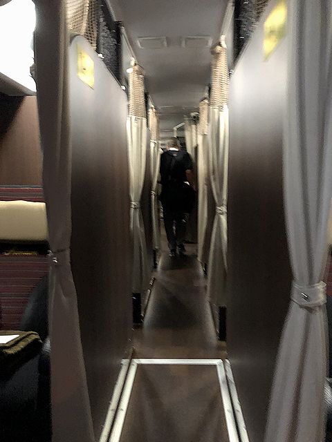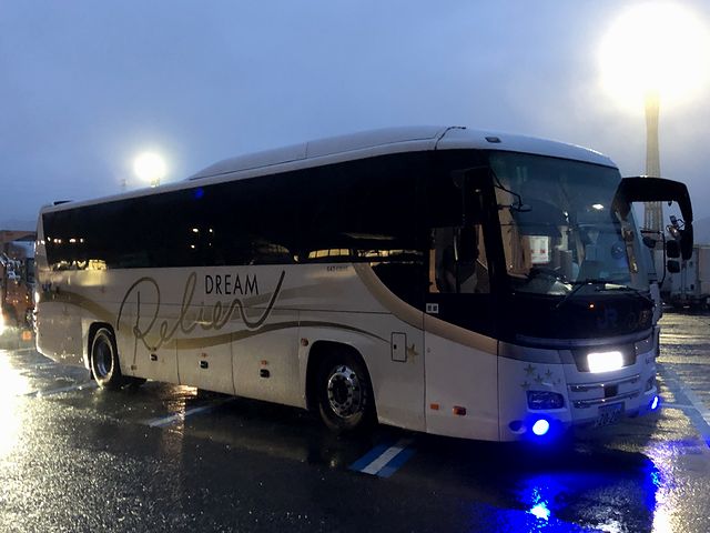 話がそれましたが、そのドリームルリエ102号は、21時30分過ぎにバス乗り場に入線。早速乗り込みます。指定された席は1A。左右1列づつ設けられたシートの最前列左側なのです。で、これがまた凄かったというか。足の方に設けられた出入口こそカーテンですが、それ以外は立派な壁に囲まれていて、プライバシー守られている感が凄いこと。更にシートが、幅61cmと私のようなふくよかな体型でも寝返りが打てる程ですし、最大リクライニング角度156度はフルに倒すと相当な寝具合で、前後のシートピッチは広いのでその恩恵をフルに受けることが。加えてシート周りも充実していて、コンセントやライトも抜かりなく装備。荷物棚も、私が1~2泊程度の旅行に使っている機内持ち込みサイズより一回り小さいくらいのバックパックが置けるくらいでしたし、足置きが蓋付きの物入れになっていたのも地味に有能。袋に入っていたアメニティーには、立派なスリッパや使い捨てイヤホンなどが入っていました。あと、これはプレシャスクラス以外のシートと共通ですが、席ごとにiPad miniが備え付けられていて、車内Wi-Fi経由で様々なコンテンツが楽しめるようになっています。で、それらの装備は、個人的にこれまで乗った夜行バスのなかで最上級。余すところなく堪能したかったのですが、椅子のリクライニングを倒し、手持ちのスマートフォンをWi-Fiに繋いでDAZNのF1中継(フランスGP)を観ていたら、いつの間にか寝落ちしてしまっていたという。