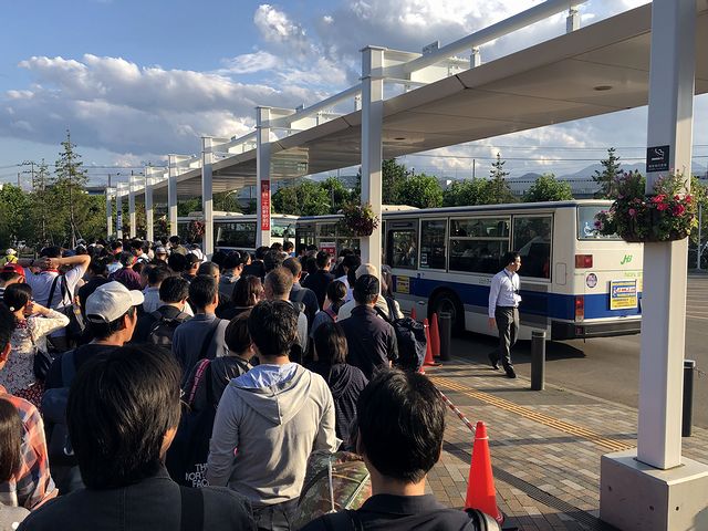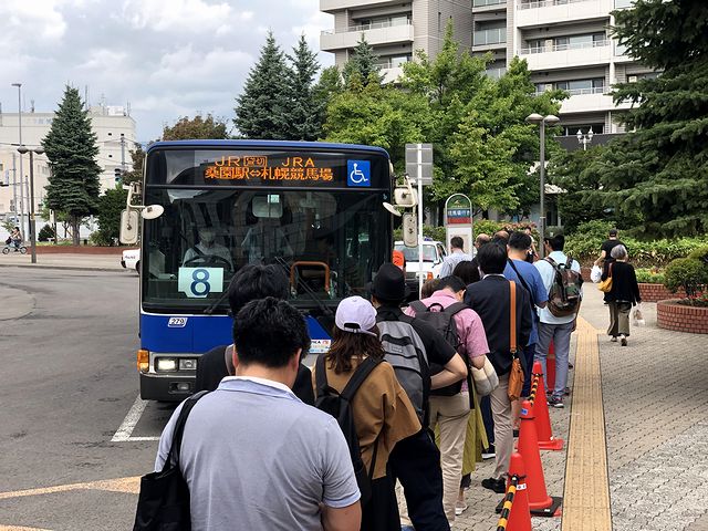 そんなこんなで桑園駅に到着したのが14時20分。そこからは、ちょうどやってきた無料送迎バスに乗車。発車して5分少々で札幌競馬場に到着しました。