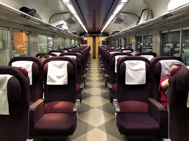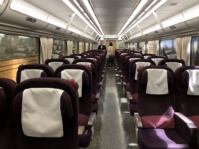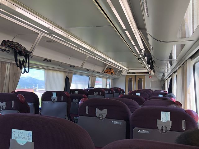 先頭車の写真を撮ったあと、早速乗車。自分で指定して取った席は、2号車の最後尾、進行方向右側の窓際なのですが、窓ガラスがとても汚れていたのが残念です。またシートは見た目的に昨日乗ったスーパー北斗のキハ281系とほぼほぼ同じような気がしたのですが、少々固めの座り心地で、私のような太った人間には座面の長さがちょっとばかり短い気がします。