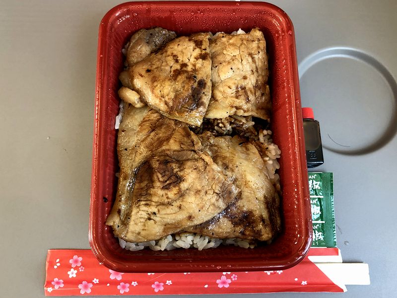 席に落ち着いたら、豚丼で早速朝食を。買った時にレンジで温めてもらったのですが、そのせいか、蓋を開けると肉とタレが相まった食欲をそそる香りが。そこに更に、別の容器に入ったタレをかけていただけば、これがもう。添えられた山椒も良く合いますね。