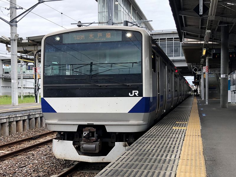 それで乗る列車は、友部駅が始発となる12時19分発の小山行き普通列車。ちなみに水戸線には大昔、上野駅から間々田駅を経由(小山駅は経由しない)して勝田駅とを結ぶ急行つくばね号や、近年では小山駅と水戸駅を結ぶ快速列車がわずかな期間走っていたのですが、ここ暫く前から普通列車のみの運転となっています。またそれに使われる車両は、E531系電車の5両編成。ちなみに水戸線は昭和42年(1967年)の電化以降、長らく403・415系電車が使われていたのですが、平成28年(2016年)3月のダイヤ改正で運用から離脱。それと平成19年(2007年)から使用されてきたE501系電車も平成30年(2018年)9月に運用を離脱し、それ以降は全列車がE531系電車5両編成での運転となっています。