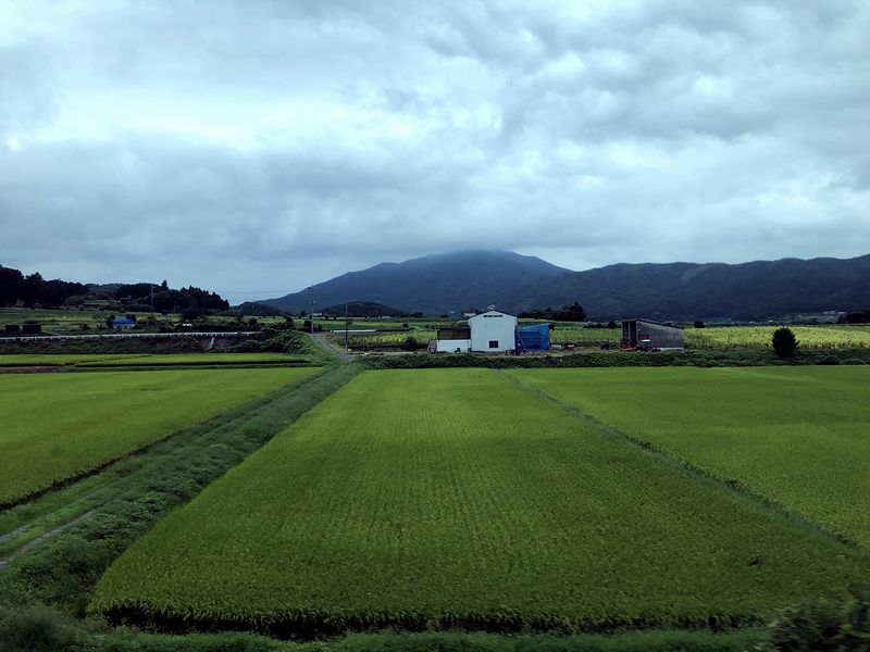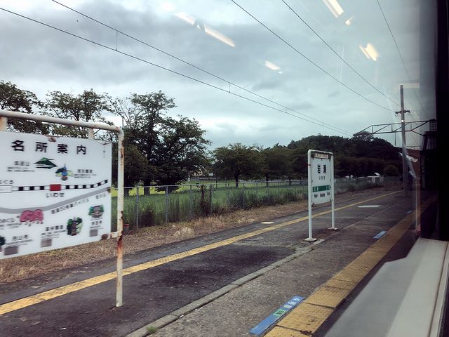 少ない乗客を2つめの笠間駅でわりと減らし、更に西へ。福原駅を出ると笠間市から筑西市へと入り、列車は筑波山系に対して北側になるのですが、これまでよりも車窓に見える筑波山系は見る角度のお陰で塊感が出てきますね。その筑波山系は、山頂部付近が雲に覆われているのが残念!もっと言うと、この日は今にも雨が降り出しそうな空模様なのがほんと勿体ない!晴れていれば、収穫前の水田と筑波山の組み合わせがとてもきれいに見えたんじゃないかなぁと。それで一時は減った乗客も、羽黒駅から女子高生が沢山乗ってくるなどして増え、更に岩瀬駅でもホームに高校生が。ここで反対方向の列車と交換。で、駅に隣接する南側に、妙に空いたスペースがあるのですが、かつてここと土浦駅を筑波山の西側を通りつつ結び、昭和62年(1987年)に廃止となった筑波鉄道筑波線の駅跡地でしょうか。