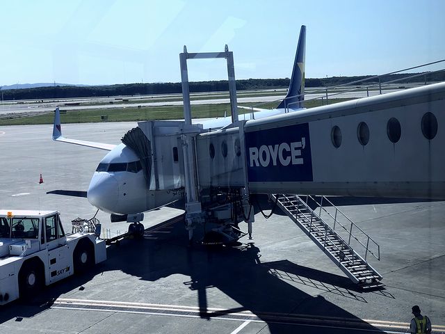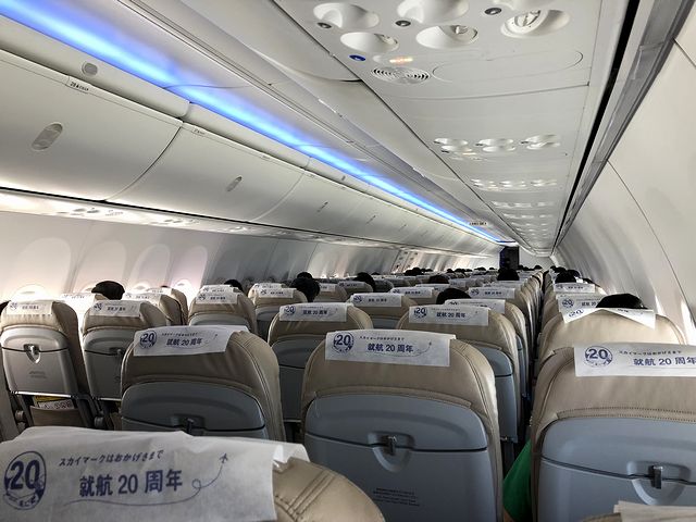 ラーメンを食べ終わって17番搭乗口に戻ると程なくの、出発30分前となる8時25分には優先搭乗が始まり、それに続けて私を含む席番の搭乗となりました。それでこの便の使用機材はボーイング737-800。通路の両側に3人がけの革張りシートが並ぶレイアウトで、左右合わせて1列6人座れるところ、この便は4人掛けにしている(理由は聞き逃しました……。)ということで、隣席が気にならないのはとても良いですね。またシートピッチは国内のLCCよりも広い31インチ(79cm)(ちなみにLCCは29インチ(74cm))なのですが、確かに圧迫感か少なく快適です。あと、私の命を預けることになるコックピットクルーは、ヘンドリー機長とヤンべ副操縦士のお二人とのこと。
