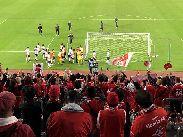 試合は、19時04分にキックオフ。試合内容については、誰か詳しい人がしかるべきところに書いているので詳細は省きますが、後半に入った66分、鹿島に先制を許すと、そのまま試合終了となり、0-1でHonda FCが鹿島が辛勝。鹿島はこの試合の前、10月18日に行われたJ1リーグの松本山雅FC戦からスタメン5人を入れ替えていたとはいえ、特に前半は、Honda FCの方がやりたいことをやれていた印象で、この時に1点でも取れていたらと悔やまれるところなのですが、鹿島の倍の14本のシュートを放ちつつも最後までゴールを割ることができませんでした。あと、今年6月から、(反則の)ハンドに関するルールが変わったんですね。後半、鹿島のゴール前で守備側の伊藤選手がハンドをしたのですが、従来ならPKになる(と思った)ところ、主審はスルー。正直、たいへんモヤっとしたまま帰ったのですが、翌日の某スポーツ新聞によると、新ルール適用とのことで。