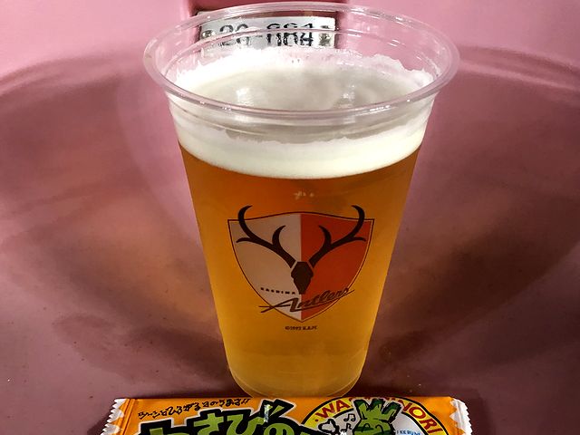 ドリンクは、もつ煮と一緒に購入したのが生ビールで、2杯目はハイボール(缶の角ハイボールでした)という感じに。ビジター側でも、カップにはアントラーズのマークが入っているんですね。あと、一緒に写っている駄菓子は、こちらの売店で酒類を買うと1杯につき1つくださったものです。