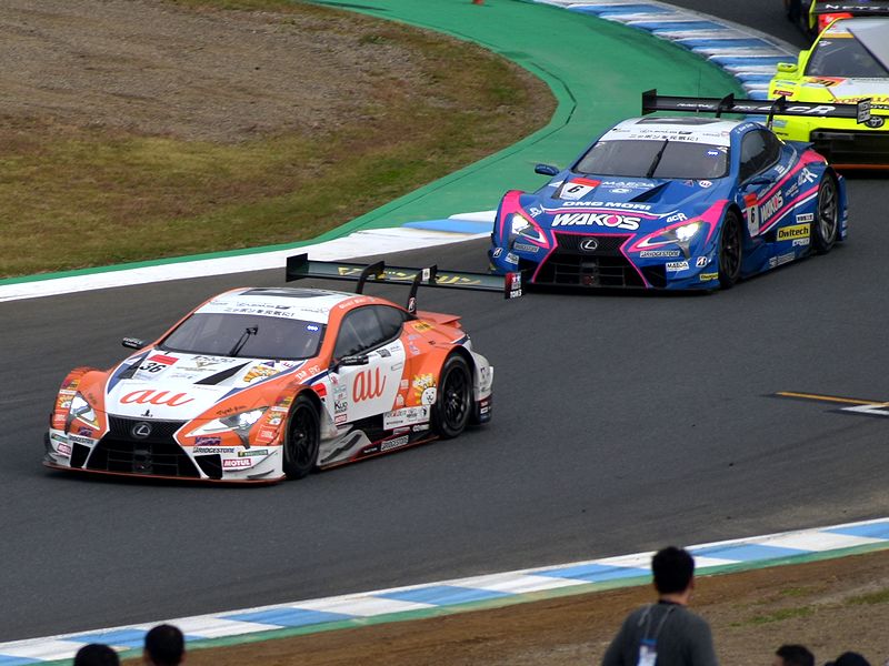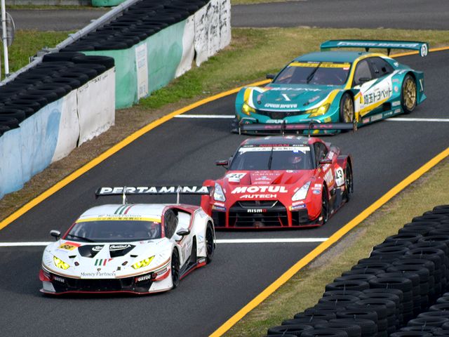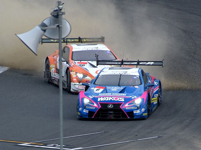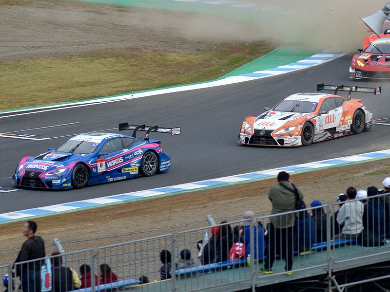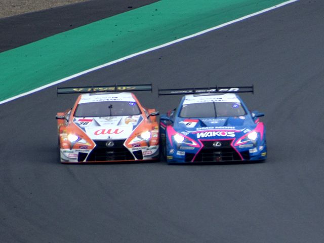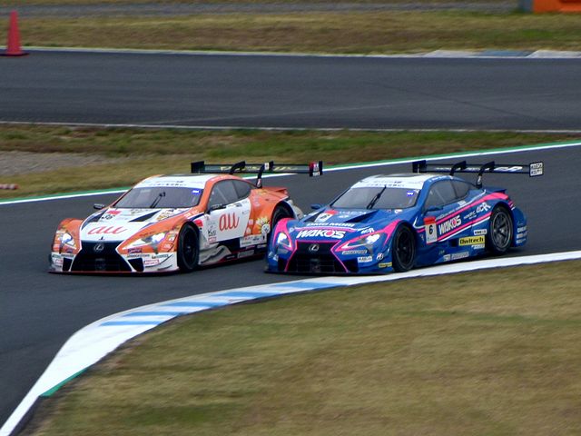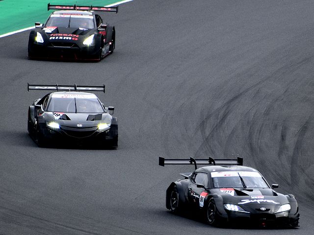 それで詳しいレースレポートはSUPER GT公式サイトを見ていただきたいのですが、まずはGT500クラスから。ポールポジションからスタートした#36 au TOM'S LC500の中嶋一貴選手がトップを快走するものの、2位以下は順位が入れ替わり、1周目にロニー・クインタレッリ選手がドライブする#23 MOTUL AUTECH GT-Rが3位から2位に。一方フロントロウからのスタートだったドライバータイトル争いで首位を走る、大嶋和也選手がドライブする#6 WAKO'S 4CR LC500が1周目で5位まで後退。逆に#6を7ポイント差で追う、ニック・キャシディ選手がドライブする#37 KeePer TOM'S LC500が予選4番手から2番手まであげ、トップの#36と共に後続を引き離す展開に。その後#6も3位まで順位を戻した後、20週目くらいから各車ルーティーンのピットストップが始まりました。
