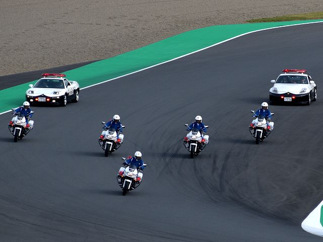 グリットウォーク、国歌斉唱、開会宣言などレース前のイベントが終わった13時30分、各クラスごとに隊列を整えて、栃木県警の白バイ、パトカー(初代ホンダ・NSXとZ33型しかもVersion NISMOらしいニッサン・フェアレディZ!!)の先導によるパレードラップ、そして続いて1周のフォーメーションラップの後、53周の決勝レースが開始されました。