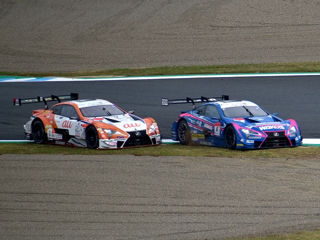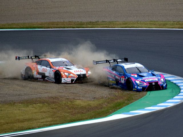 戦闘機の爆音の後は、レーシングカーの爆音が響く番。各車、昨日の予選で決定したグリッドに付く前、最終チェックのために20分間のウォームアップ走行が行われます。それで各車、思い思いに周回をするのですが、その際、#36 au TOM'S LC500がコースアウトしたところを同行者が写真に撮っておいてくれました。あと#3、GT500クラスで10番手だったCRAFTSPORTS GT-Rにトラブル発生。なんと、決勝への出走ができなくなってしまいました。一方、エンジンシラブルで昨日の予選に出走できなかった#12 カルソニック IMPUL GT-Rは、最後尾から出走できることに。