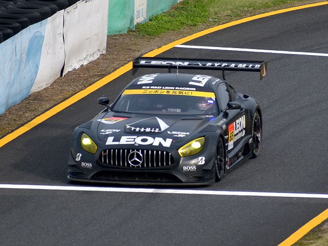 そして各車がルーティーンのピットストップに入っていったのですが、それがひととおり終わると蒲生尚弥選手に替わったに#65 LEON PYRAMID AMGがトップに!ピットストップの際、ドライバー交替と給油のみ行い、タイヤは交換せずに出たことで大幅な時間短縮をして先行する各車のアンダーカットに成功したという。その後も#65はタイヤ無交換にもかかわらず軽快なペースで逃げ、平中克幸選手に替わった#11がそれを追う2位、そして3位は高木真一選手から福住仁嶺選手に交替したドライバータイトル争いで首位に立つ#55 ARTA NSX GT3という展開に。
