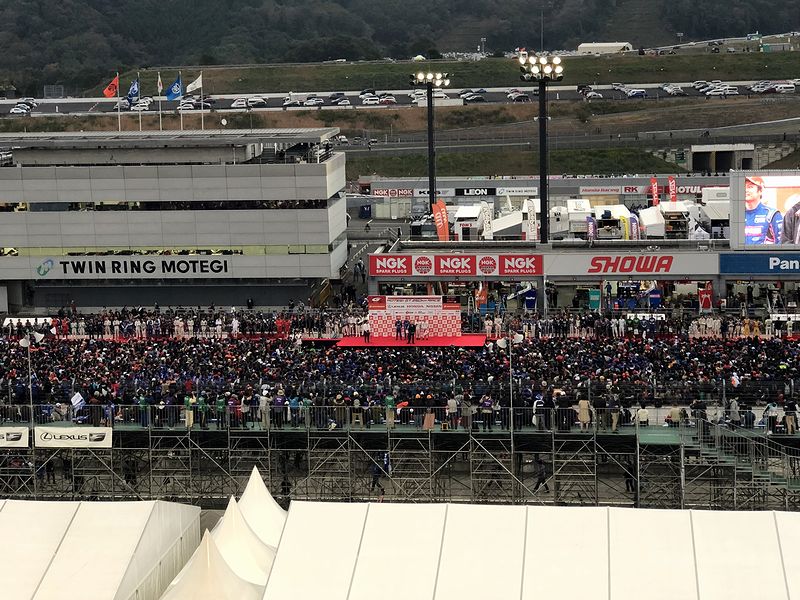 両クラスの暫定表彰式終了後、全チームのドライバーとGTアソシエイション(GTA)の板東正明代表によるグランドフィナーレが。個人的には今年、本格的にモータースポーツ観戦に復帰して、このもてぎ以外のレースはJ SPORTSオンデマンドで観ていた程度にもかかわらず、やっぱりシーズン最終戦が終わったこの瞬間は、とても感慨深いものがありましたね。もっともこの3週間後には、ドリームレースと銘打たれたドイツツーリングカー選手権(DTM)との特別交流戦が控えているので、各チームの皆様はまだまだ休めないし、私自身、日本のモータースポーツ史に残る歴史的な日になると(TV観戦の予定にもかかわらず)ワクワクしているんですが。