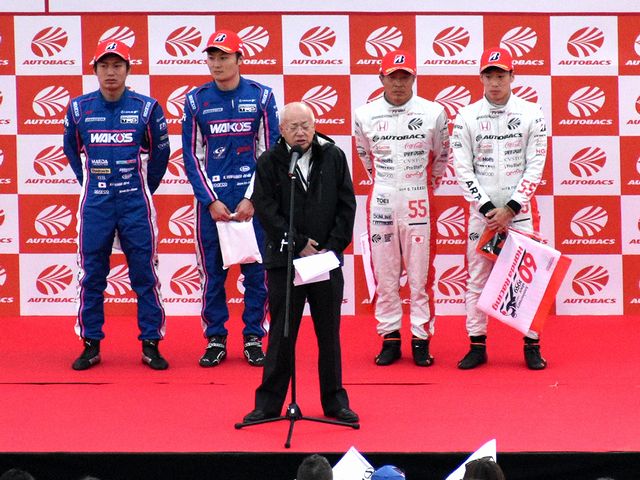 【挨拶する板東GTA代表と両クラスのドライバーチャンピオン】