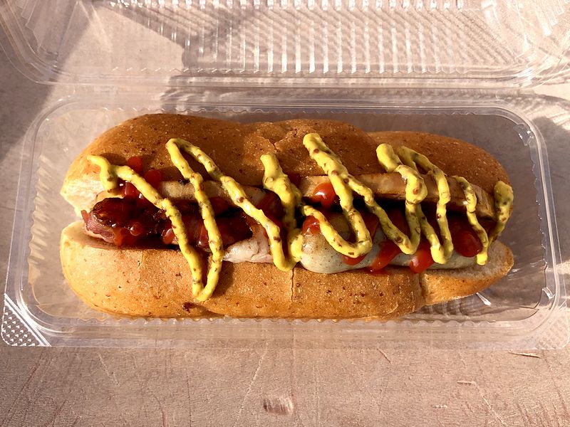 で、その時のことを思い出し、今回は朝食にこちらの品を。いろいろドッグは名前のとおり、こちらの手作りハム、ソーセージ、ベーコンが色々と入っているホットドッグ。どれもパンに挟む前、鉄板でしっかりと調理されるのですが、それぞれの違う味わいが楽しめて、ほんと久しぶりにだけどほんと美味しいなぁ、と。ちなみにこちらのお店、ホットドッグだけではなくソーセージ類の盛り合わせもあるので、次は是非とも、ビールと共にいってみたいですね。