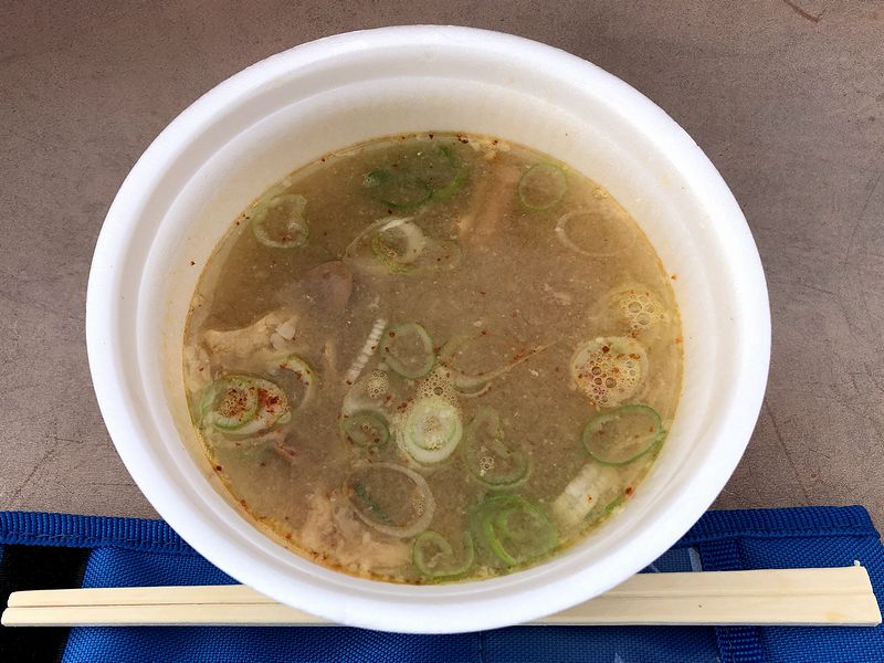 それで今回いただいたもつ煮ですが、具はわりと歯応えのある豚モツ以外薬味のネギのみとシンプルで、お味の方も素朴な味噌と強めのモツの風味がシンプル。そこに、先述のネギと、一味唐辛子がわりと効いてます。つゆだくを通り越して具の多い味噌汁的感じだったのですが、それと相まって、とても体が温まりました。