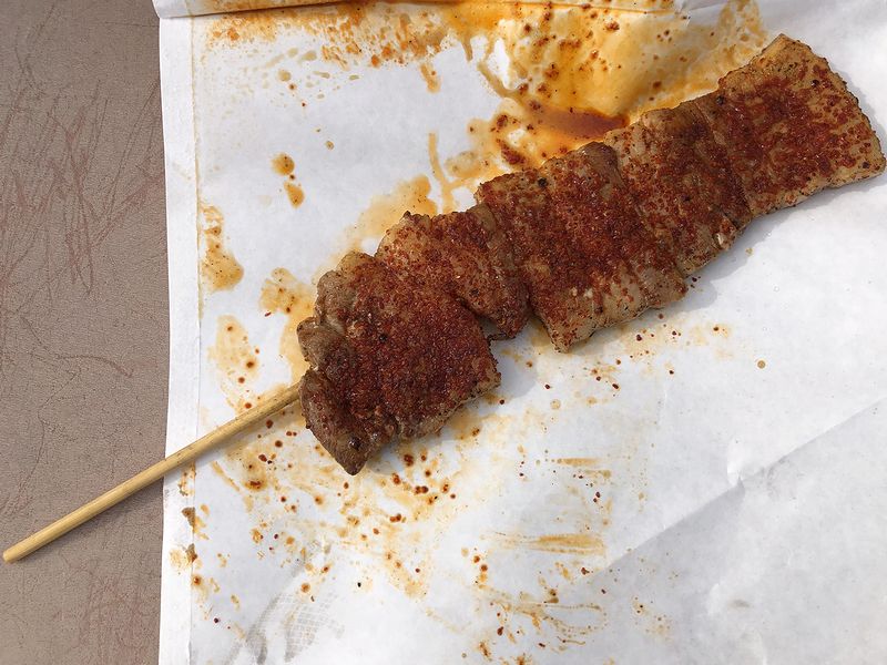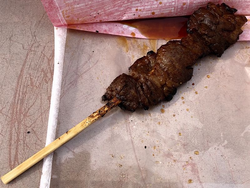 それなのに注文は、ステーキ串(500円)ではなくこちらの中落ちカルビ串を。手渡された時に入れられた袋がとても見覚えがあるものだったので気が付いたのですが、今や全国展開する栃木県宇都宮市発祥の移動販売店「やきとり龍鳳」さんの別ブランドだったんですね。で、そう思っていただいたからか、タレがとても馴染深い味わいというか。もちろん肉もジューシーで、間違いがなかったです。