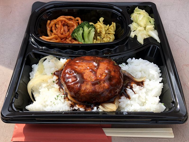 そんな中から同行者のリクエストで購入したのがこのお弁当。写真でもわかると思うのですが、盛りが良い御飯の上に、ハンバーグがドドンと載っていますね。で、例によって少々いただいたところ、ハンバークはミシっとした密度感のあるタイプ。付け合せのパスタ2種やキャベツも良い味加減でした。