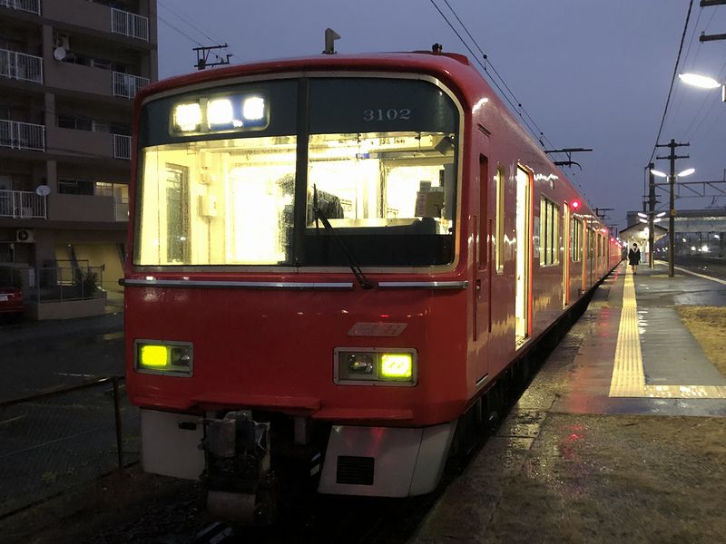 それでまず弥富駅から乗る列車は、6時46分発の国府行き。車両は、先程の折り返しとなる3100系2両編成+3500系4両編成の6両編成で、これがなかなかに名鉄らしい運用というか、まず普通列車で弥富駅を出発し、名古屋本線へと入る須ヶ口駅から準急列車に。名鉄名古屋駅からは急行列車となるものの、東岡崎駅から終点の国府駅まで再び普通列車になるという。その列車の先頭車、3102(ク3100形、平成9年(1997年)製造。)に乗車。車内は名古屋方面への通学でしょうか?中学、高校生が多いのですが、この時間から通学とは大変ですね。そういえば先程の駅まで送ってきたクルマから降りてきたのは、学生さんばかりでした。