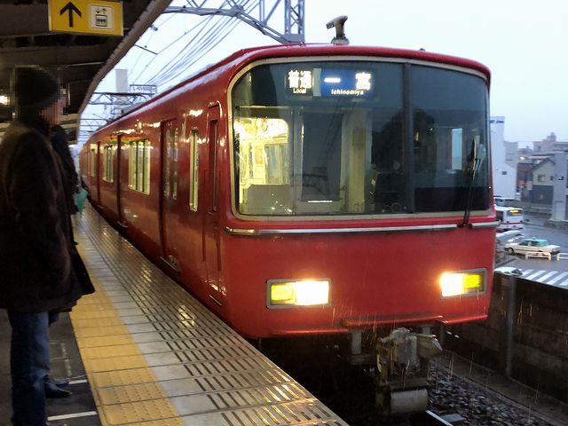 津島駅のホームに降りると、通勤通学客でわりと混雑しています。で、それらの人達に混ざって待つ次の列車は、津島駅始発となる7時00分発名鉄一宮行き普通列車。程なくして、弥富方面からスカーレット色した4両編成の電車が入線してきましたが、その車両は、これまで乗ってきた3500系のグループではなく、それより1世代前の3扉通勤型車両である6000系というグループに属する車両。ちなみに、3500系グループが約200両、6000系グループが約300両と、名鉄の通勤型電車の中ではこの2つが数が多いグループになっています。それでその6000系グループの中でも、この列車に使われているのは6800系という比較的製造が新しい形式で、後から調べたところ、私が乗った先頭車の(ク6800形)6835という車両は、平成23年(1991年)に製造され、平成23年(2011年)に尾西線・豊川線用ワンマン運転対応車両に改造。ちなみに6800系は2両固定編成なので、それを2つ繋げて4両編成を作っているんですね。