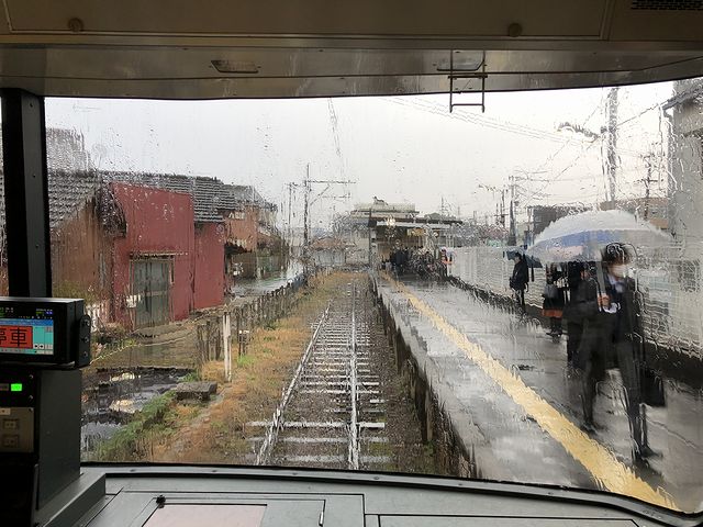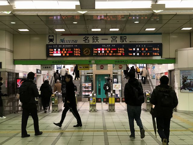 その後列車は、いかにも郊外という景色の中を走行。駅に停まる度に通勤、通学の乗客が増え、また肩身が狭くなる気が。そしてここから先は単線区間となる森上駅で、反対方向の列車の交換待ちをしてから発車したのですが、この頃には、車内の混雑と、人いきれによる窓の曇りで、外は見えなくなってしまいました。やがて混雑する列車は、苅安賀駅でも交換待ちをしつつ、定刻の7時34分よりも若干遅れて、高架駅となっている名鉄一宮駅に到着。