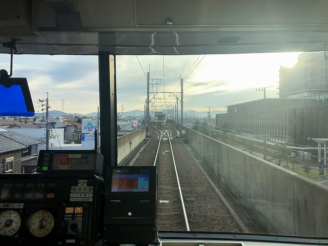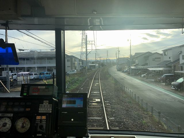 八幡駅を出るすぐに地上に降り、住宅地の中を淡々と走行。枕木は木製で、タタンタタンと線路の継ぎ目を通過する音が頻繁に聞こえることから、長さ100mレールが使われているのでしょうか。あと線路の隣をあまり立派じゃない道路が並走していることと、その道路と線路の高さがあまり変わらないのは、この豊橋線が元々は鉄道ではなく、軌道法に基づく軌道(ものすごく雑に言うと「路面電車」の類。)として建設されたことと関係があるのでしょうかね。