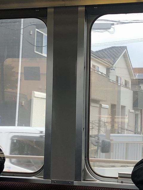 次の土橋駅は、この先の梅坪駅で接続する豊田線の車両の留置線がある関係で、この駅始発列車も設定されている駅。ふと振り向いて車内を見ると、駅ごとに乗客が降りたのか、ロングシートには一部空席が出来ていました。もっとも今更座らずに、このまま終点まで乗務員室直後に立って行こうと思いますが。それでここを発車して程なくすると一瞬町並みが途絶えるのですが、そのあたりに、珍しい木製架線柱が残っているのが見えました。そして次の上挙母(うわごろも)駅は、かつて岡崎市内まで通じていた挙母線が分岐していた駅。ここで3度めの列車交換を行います。