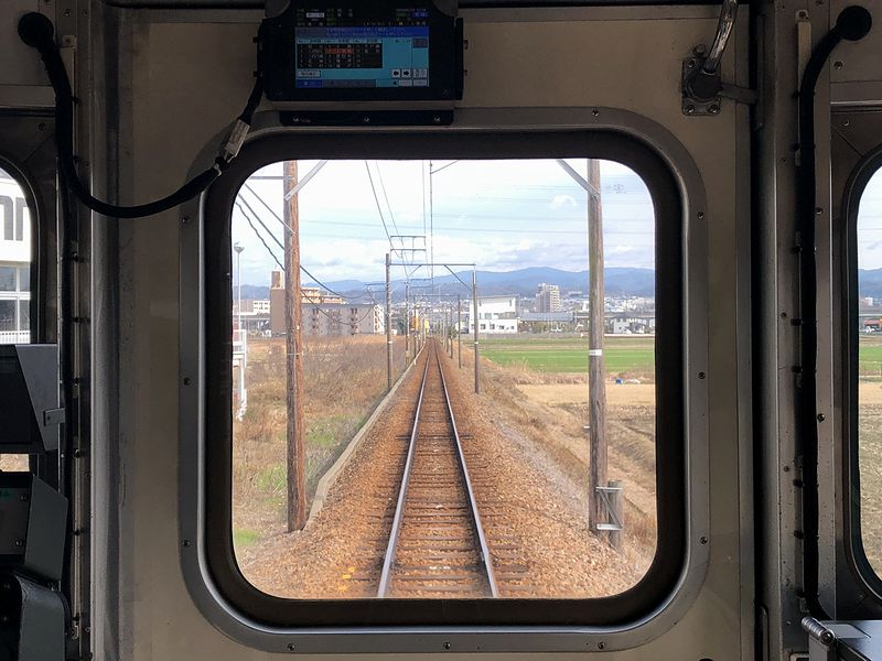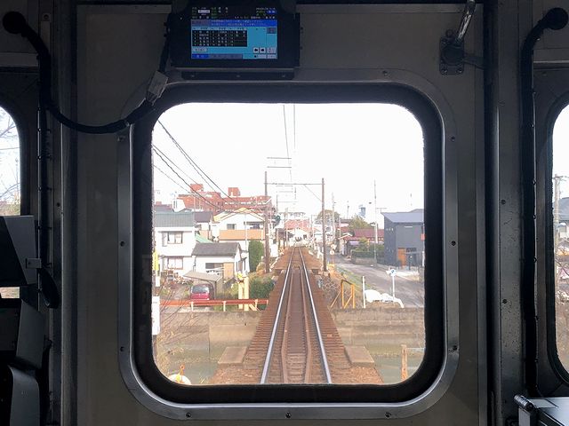 若林駅で2度めの列車交換を終えた列車は、ここから暫くの間、前方に向かって線路の右側は宅地、線路の左側は農地という景色の中を走行。その際、線路は何本かの細い用水路を短い橋梁で跨ぐのですが、橋梁の前後には、白く塗られた古タイヤが埋め込まれています。これは名鉄独特の風習ですかね。それと共に珍しく感じたのは、1月の下旬にもかかわらず、田んぼに水が入っているところがあり、更にはトラクターもその中に。このあたりは代掻きがとても早いんでしょうかね。もっとも、この日は個人的に代掻きが行われる季節のように暖かく、昨日は気温的に丁度良かった冬用のコートを着ていると茹だってしまうようでしたが。