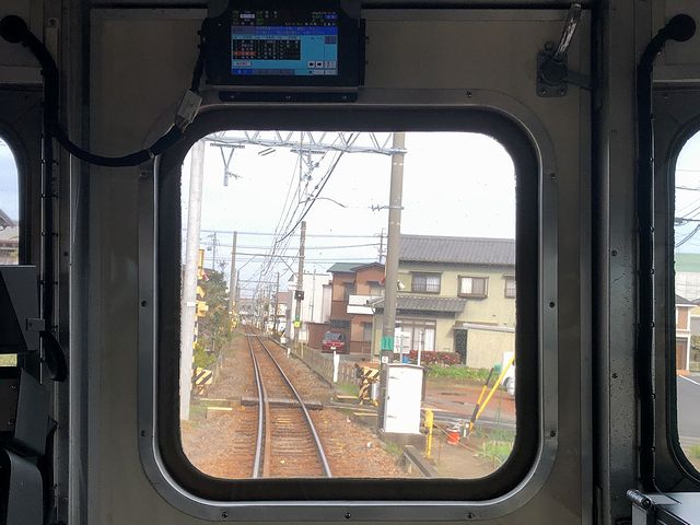 碧南駅からは、乗ってきた列車の折返しとなる11時12分発、知立行き普通列車に乗車。車両は先頭車の6221(モ6200形)ですが、丁度この頃、2夜連続の寝不足が祟って眠くなってきたこともあり、先頭の乗務員室直後に立って前方を眺めることに。