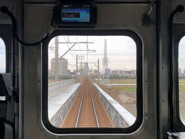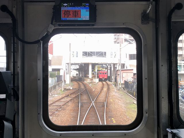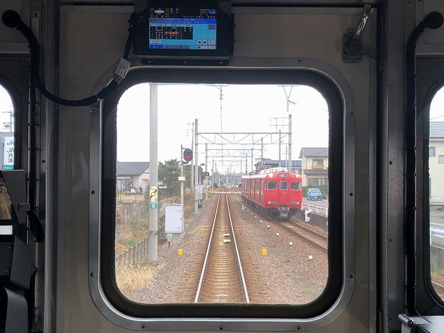 生憎なのか結果的にその方が良かったのか、乗車した時には既にロングシートは埋まっている状態だったので、この列車も引き続き、先頭の乗務員室直後に立って前方の景色を眺めることに。定刻に発車すると程なく、海線との分岐を左にカーブ。名古屋本線を潜るとすぐに、三河知立駅に停車。ここで列車交換を行いました。