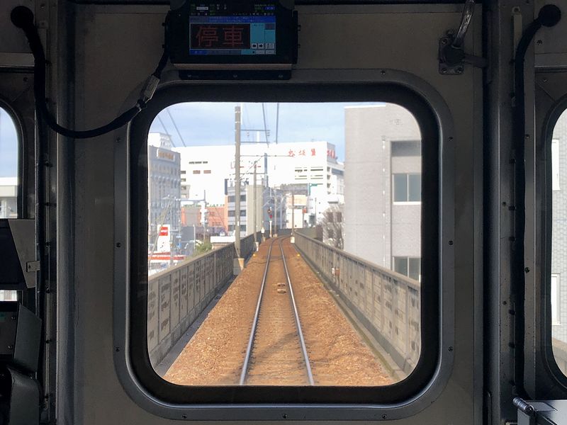約3分で次の重原駅に停車すると、全ドアが開放。この列車はワンマン運転ですが、今朝の豊川線のように運転手さんは運賃収受を行わないタイプというのは運転席直後に運賃箱がないのでわかっていましたが。発車後しばらくしてJR東海道本線を跨いで急カーブすると、そのJRとの接続駅である刈谷駅に停車。乗客は乗車するよりも下車する方が遥かに多く、車内は空き気味になりました。そして刈谷駅を発車すると高架線に登り、刈谷市の市街地を進むのですが、沿線は高層マンションを始めとする高いビルが多く、都会の雰囲気も。その雰囲気のまま、高架駅の刈谷市駅に停車。ここでも乗客が多数下車と思いきや、たまたまなのか、それほど降りなかったのが意外に感じます。