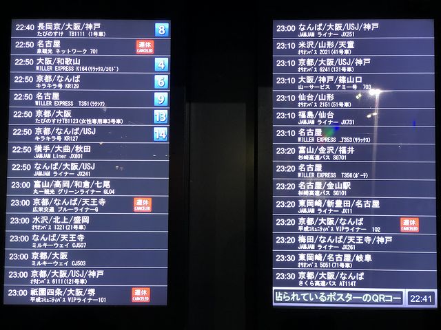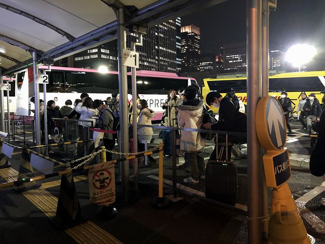 東京駅で列車を降り、酔ったお陰で旅行鞄の重さはあまり気にならなくなったので足取り軽く鍛冶橋駐車場まで歩いて移動。以前、鍛冶橋駐車場から夜行バスに乗った時は有楽町駅から歩いたのですが、ホームから駅出口の距離の差の分、有楽町駅からのほうが近く感じたのと、駅構内はともかくとして、夜の時間帯の駅周辺の利便性も合わせると、有楽町駅の方が便利に感じました。