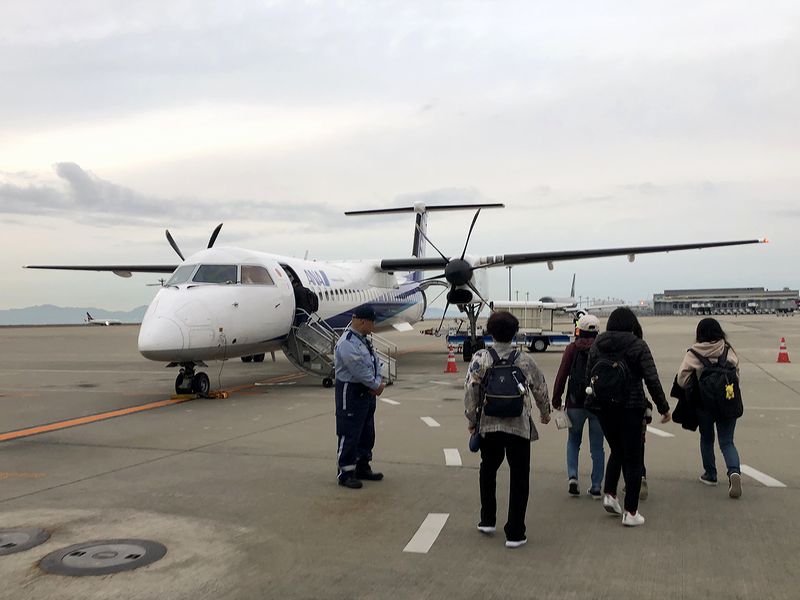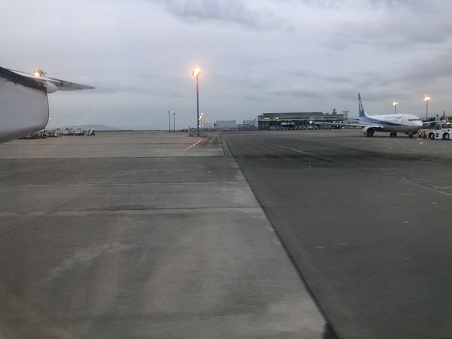 お腹もくちくなったところで、保安検査所を抜けて出発ロビーに移動。ANA496便はボーディングブリッジからの搭乗ではないようで、階下の101番搭乗口へと。で、優先搭乗のあと後方席の私のグループは17時ちょうどに搭乗開始。なんと、バス連絡ですらなく、徒歩での搭乗となりました。