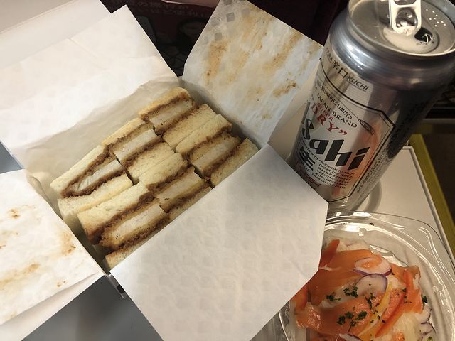 20時3分の定刻に京成上野駅へと到着後、JRの上野駅まで移動し、20時25分発の宇都宮行き快速ラビット号に乗車。ここ暫く前から、よっぽど変な時間に乗る時以外は、東京方面からJR、特に新幹線や普通列車・快速列車のグリーン車に乗って帰ってくる際には、乗車前に駅弁やつまみと酒を買い込んで車中で飲むのが恒例となっているのですが、生憎上野駅の駅弁屋さんには、いつも買う好きな弁当(深川めしやチキン弁当)やつまみ類(国技館焼き鳥や崎陽軒のシウマイ)がどれも品切れ。これじゃつまみは改札口から入る前に駅構内のスーパーで買ったサラダだけかなと思ったものの、ビールを買いに入ったホームのニューデイズで、好物の万かつサンドを発見。先程味噌カツをいただいた筈なのですが、この、肉の万世謹製の万かつサンドは、決してオレを裏切らないんです。
