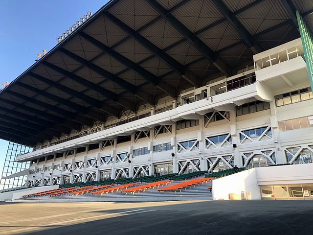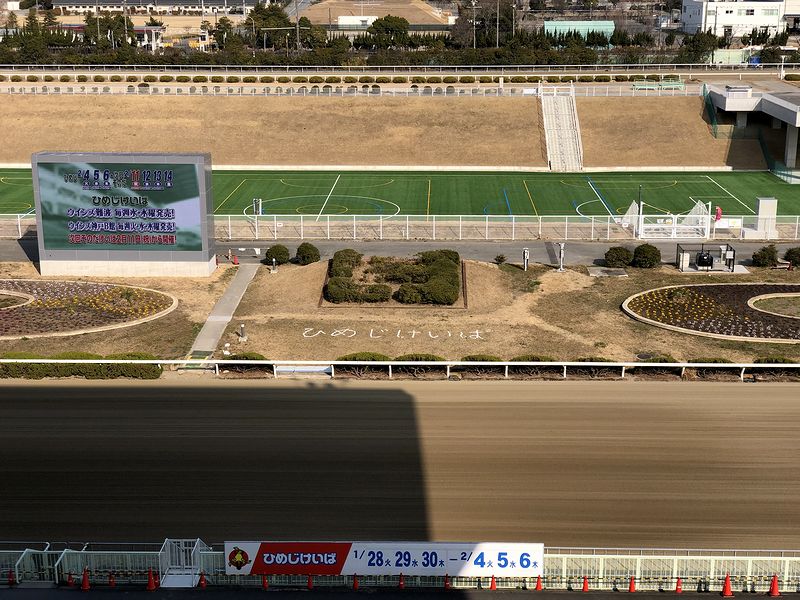 ですがその間、馬場内に元々あった球技場(野球場とサッカー場?)の替わりに、姫路市内を流れる船場川の洪水調整池とその内部に人工芝のサッカー・フットサル場を設置。スタンドも耐震改修工事を行った上、4階の1フロアを卓球場やスポーツスタジオにするなど、地域防災拠点化や競馬開催時以外の使用も出来るようリニューアルしたうえ、特別観覧席などの観戦施設も大幅に改良がなされ、令和2年(2020年)1月と2月、8年ぶりに姫路競馬場で競馬が開催される運びとなりました。