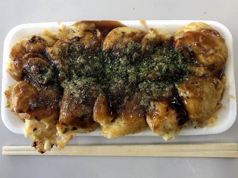そんな中、店頭で焼かれていたのがこちらの品。タイミング悪く、丁度作りはじめのところで声をかけてしまい、作っていたお兄さんから「まだ20分くらいかかるよ」と言われたのですが、実際にはそんなに待たずに出来上がり、焼き立てを買うことが出来ました。で、そのお味ですが、ふわふわの生地が当地らしくて何とも良いですね。その味付けと、上に掛かったソースとの塩梅もいい感じ。ほんと、当地のたこ焼きは外れがなくて良いなぁ、と。