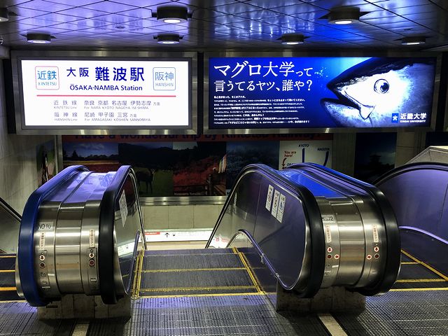 宿を出て10分とかからずに、大阪難波駅に繋がると思われる大阪メトロなんば駅の入口があったので、そこから地下へ。この時、寝ぼけた頭で適当に入ってしまい、一瞬「ここはどこ?」となったのですが、程なくして、大阪なんば駅へと降りるエスカレーターを無事発見。そこにあった近畿大学の広告が、寝ぼけた頭でもいかにも当地らしいなと思いました。