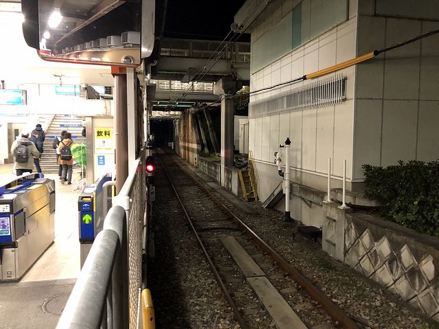 それで帰り道は、先頭部右側で前方を眺めつつ行くことに。本当は、夜が明けてから乗りたいところなのですが、こればっかりは自分で立てた旅程の都合なので仕方がないです。で、武庫川団地前駅を出た列車は右にゆるくカーブすると、終点の武庫川駅まで武庫川の堤防に沿って走行。堤防の反対の左側は住宅地が続き、そのせいか駅ごとに乗客が乗ってきて、先程と同様、武庫川駅では結構な数の乗客が下車して中間改札を通っていきました。