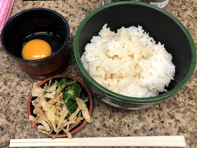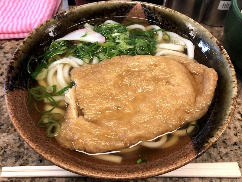 それで今回は、ベタですが関西と言うことできつねうどんをいただくことに。早速つゆを一口啜れば、昆布にかつお節、さば節にうるめ節を使ったという出汁は、先程嗅ぎ続けた筈なのですがそれ以上に香り高く感じ、甘さ控えめな味付けも丁度良く。茹で麺のうどんは、太さは箸よりやや細めで、プリっとしつつ柔らかさのある食感が良く、そこに甘目の味付けが染みた大ぶりでふっくらとしたお揚げが載って、これが、もう。一緒にいただいた卵かけご飯も、フライドオニオンが面白いアクセントになっていました。