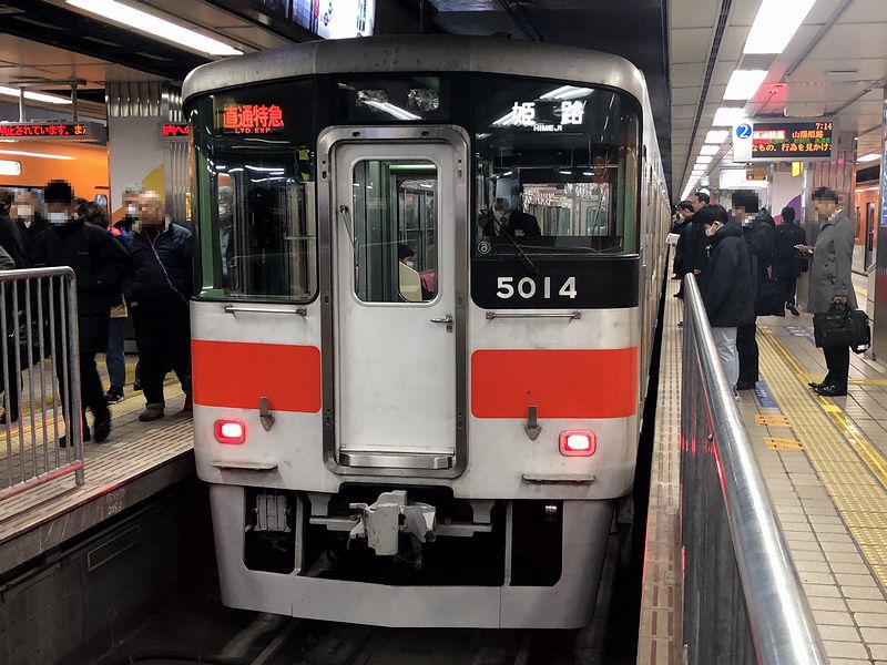 それで先程述べたように、この直通特急。全車ロングシート編成は避けたかったのですが、改札口を通ってホームに向かい、丁度停車していた7時14分発が、山陽電気鉄道の5000系というセミクロスシート車で、この時点で十分に空席があったものだから、即座に乗ってしまうことに。実はこの列車から5本連続で、クロスシート車の確率が高い山陽電気鉄道の車両を使用した列車が続ことは、事前に山陽のウェブサイトで見られる時刻表で調べていたのですが、あっさり1本目にしてお目当ての列車に乗ることができてしまいました。