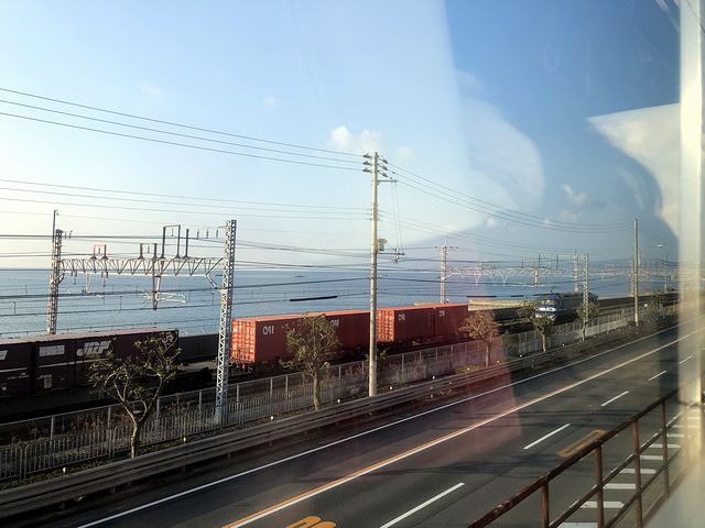 列車は山陽で最初の停車駅である板宿駅を過ぎてから、暫く続いた地下線から地上へと。その後、月見山駅、山陽須磨駅と停車しながら海沿いへと進み、瀬戸内海に近づくとJR山陽本線や国道2号と併走します。特に、須磨浦公園駅-山陽塩屋駅間は、山が海に迫る地形のため、海沿いのわずかなスペースにこの3路線がひしめく感じに。そんな時、JR線には貨物列車が走っていて、しばらくの間、並んで走ってたのですが、こちらが山陽垂水駅に停車するために減速すると、貨物列車に抜かれる形に。