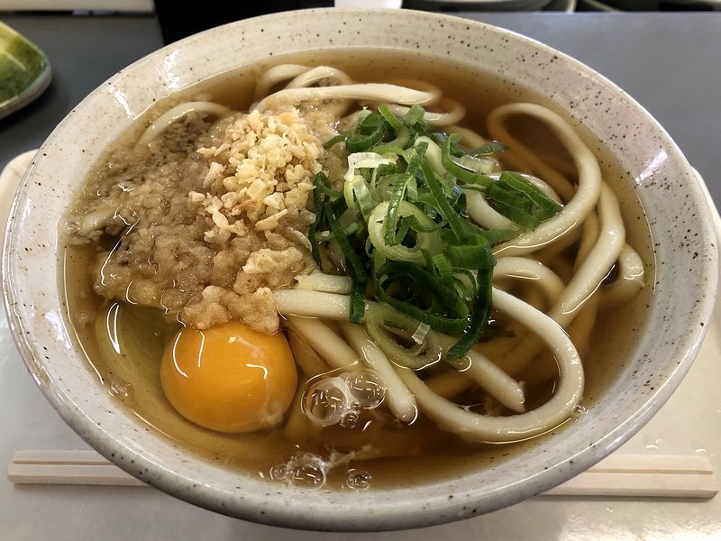 丼から早速つゆを一口啜ると、出汁感は結構しっかりしているけど、それよりも、一口目で味がわかるハッキリした味付けが、この手のお店っぽくて良いですね。更にそこに、天かすが香ばしさとコクを加えます。またうどんは、プリプリッとした食感の茹で麺。そして生卵は、私は子どもの頃から、途中で黄身を割ってうどんに絡める派。こちらのお店はツユの味がハッキリしているので、生卵でも薄まる感が無くて最後まで良い感じでいただけました。