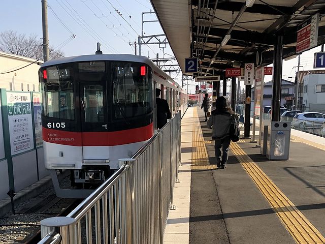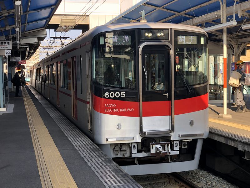 うどんを食べ終わったあと、行き止まり式となっている網干線のホームで待っていると、入ってきたのが折返し山陽網干行きとなる普通列車。車両は、最新の6000系という形式の3両編成でした。それでこの6000系は、平成28年(2016年)から導入が始まった山陽では最新の形式。従来の山陽の車両同様、両開き3扉を持つ長さ約19mの車両で、車内はロングシート。主電動機の制御はVVVFインバータ制御方式を採用ししています。また当初は3両編成から導入され、令和元年(2019年)からは4両編成の導入が開始。3両編成単独もしくは4両編成単独で運用される他、3両編成を2つ繋げた6両編成で直通特急の運用に入ることもあるそう。で、乗り込んだのは、3両編成の真ん中、6305(サハ6300形)という車両で、調べたところ平成29年(2017年)に製造されたようですね。