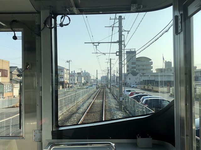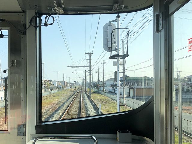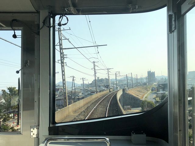 もっとも前方の景色は、見渡す限りひたすら住宅地という感じ。っていうか姫路って、とても大きな都市ということを、この景色で実感したというか。それで一つ気が付いたのがこの網干線、全線単線ですが、敷地は複線分確保してあるところが多いんですね。ただ、架線柱は真新しい単線用のものが使われていたので、しばらくは複線化する予定はないのでしょうかね。